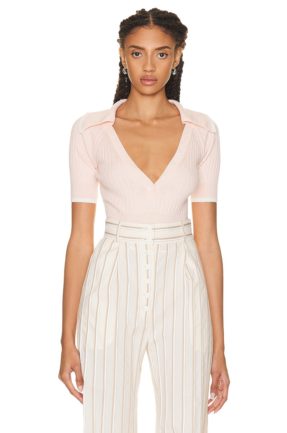 Image 1 of MATTHEW BRUCH Polo Rib Knit Crop Top in Peach & Cream