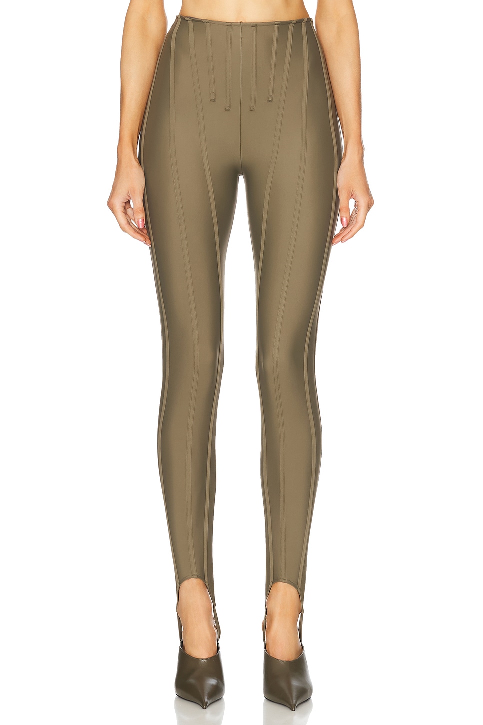 78% recycled polyamide, 22% elastane. Made in Portugal. Machine wash. Pull-on styling. Stirrup cuffs and boning at waist. Midweight slinky jersey fabric. Our Style No. MUGL-WP77. Manufacturer Style No. 25P3PA0481842.