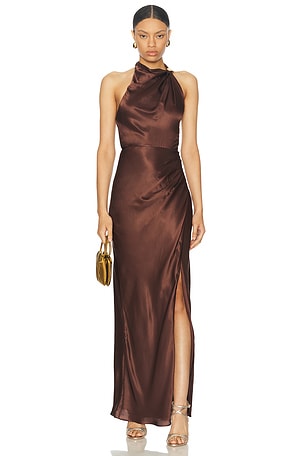 Galilea High Neck Gold Trim Maxi Dress in Chocolate
